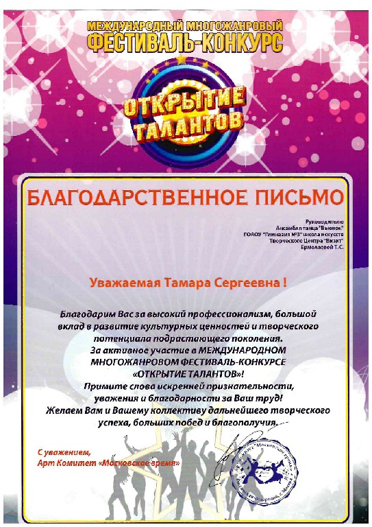 Благодарственное письмо в Международном многожанровом Фестиваль-конкурсе "Открытие талантов"
