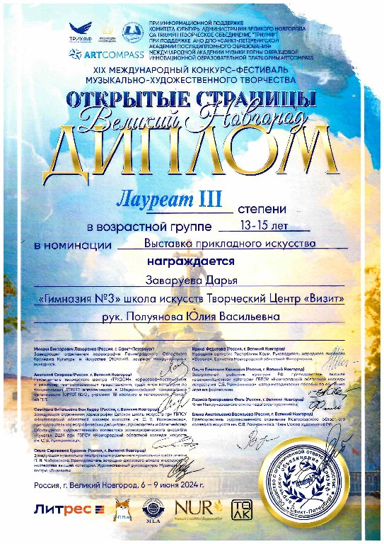 * Диплом Лауреата 3 степени Всероссийского конкурса художественного и технического творчества "Новогодний фёйерверк-2024", от 05-08 января 2024 года, Великий Новгород