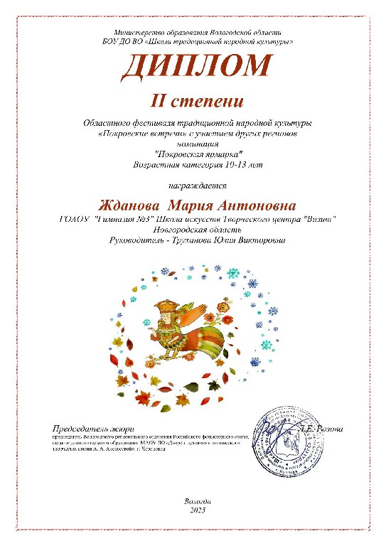 * Дипломант II степени в Областном фестивале традиционной народной культуры "Покровские встречи", Вологда 2025
