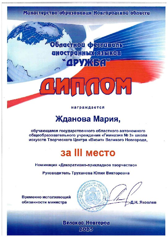 * Диплом за III место в Областном фестивале иностранных языков "Дружба", Великий Новгород 2025