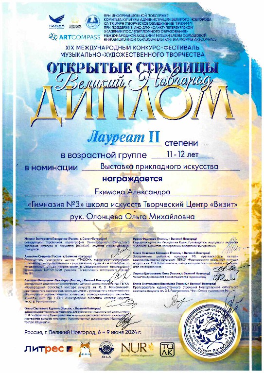 * Диплом Лауреат II степени в XIX Междуународном конкурсе-фестивале музыкально-художественного творчества "Открытые страницы. Великий Новгород", 6-9 июня 2024