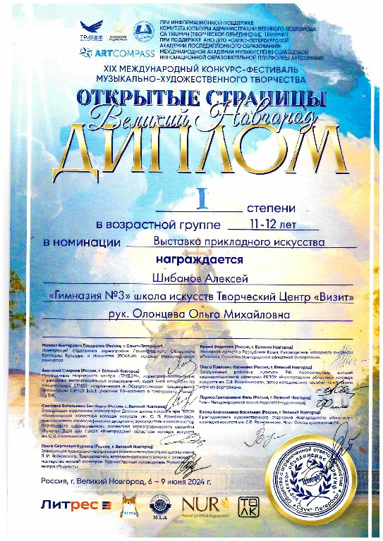 * Диплом Лауреат III степени в Областном конкурсе детского художественного и декоративно-прикладного творчества "Вдохновение", Великий Новгород 2024
