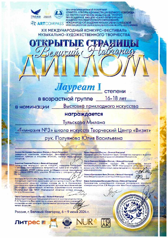 * Диплом Лауреат I степени в XIX Междуународном конкурсе-фестивале музыкально-художественного творчества "Открытые страницы. Великий Новгород", 6-9 июня 2024