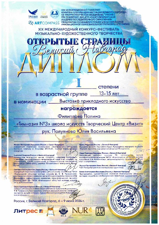 * Диплом I степени в XIX Междуународном конкурсе-фестивале музыкально-художественного творчества "Открытые страницы. Великий Новгород", 6-9 июня 2024